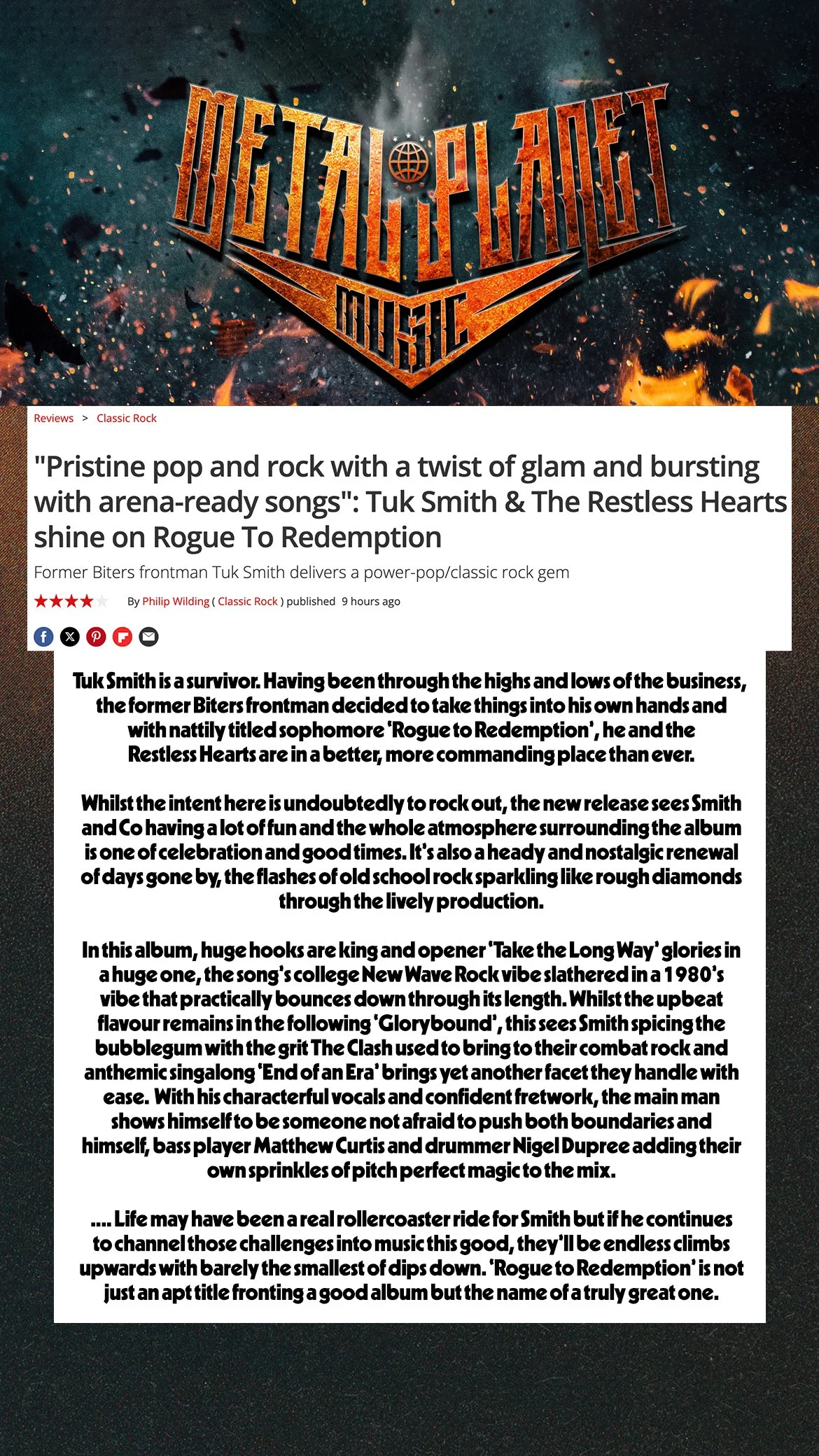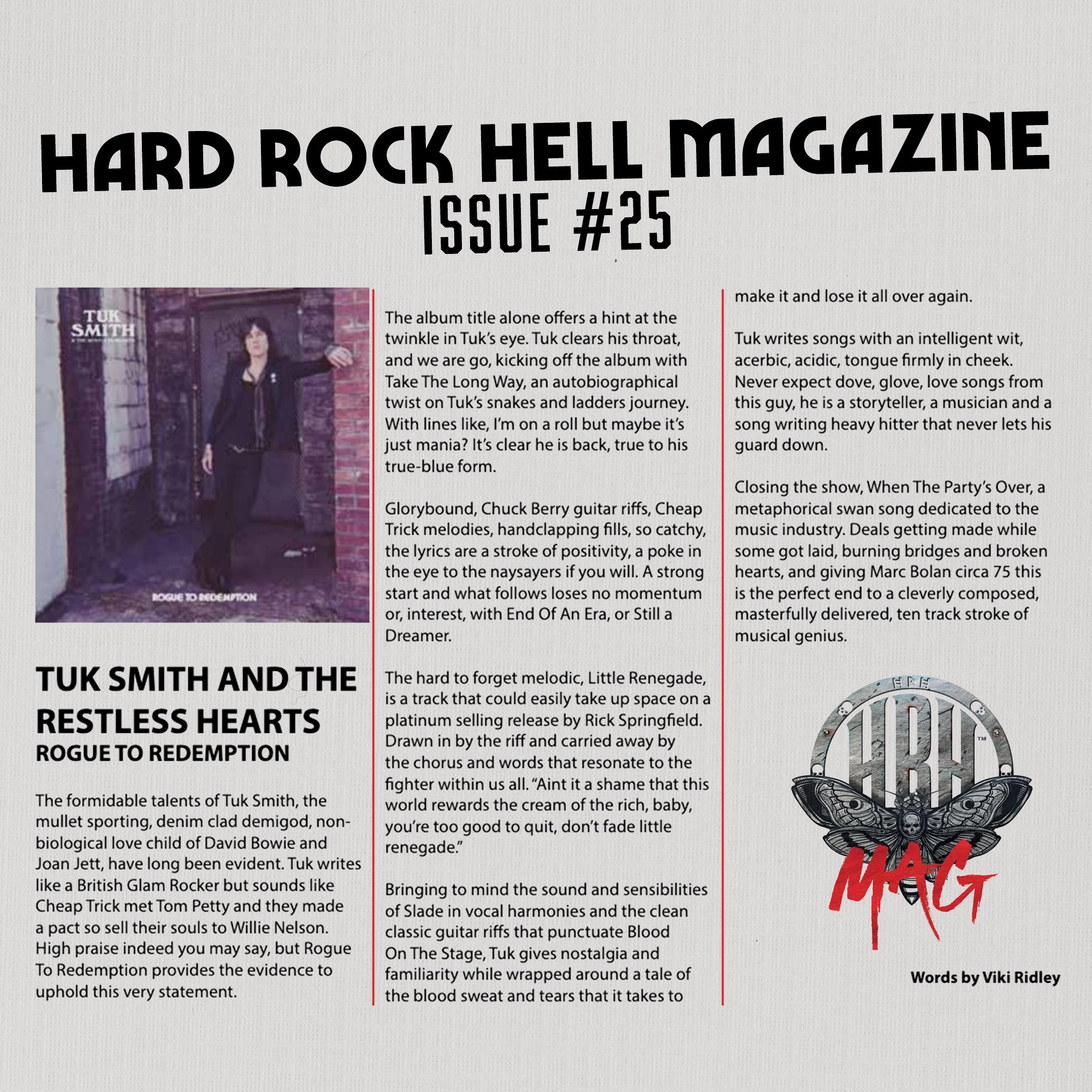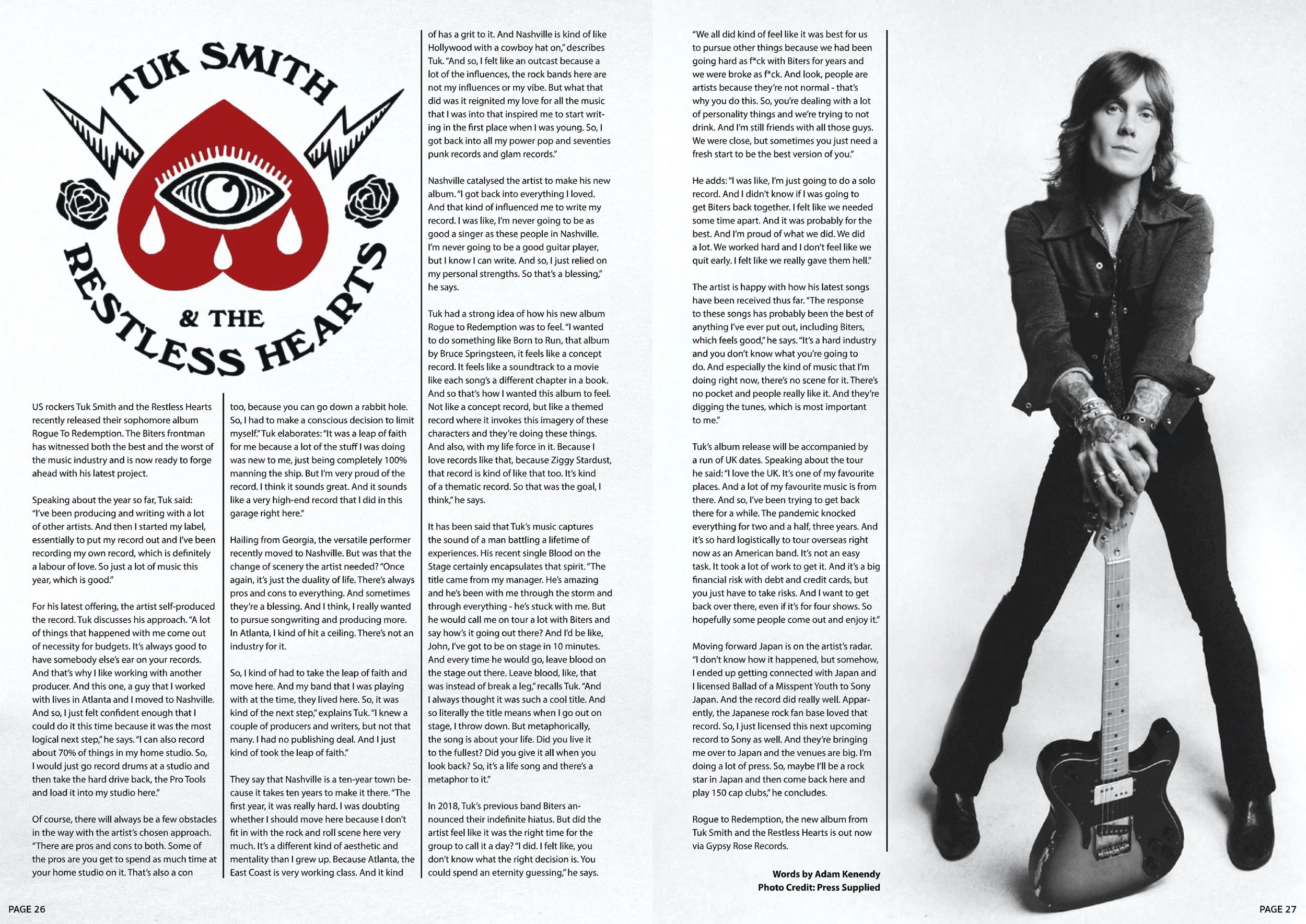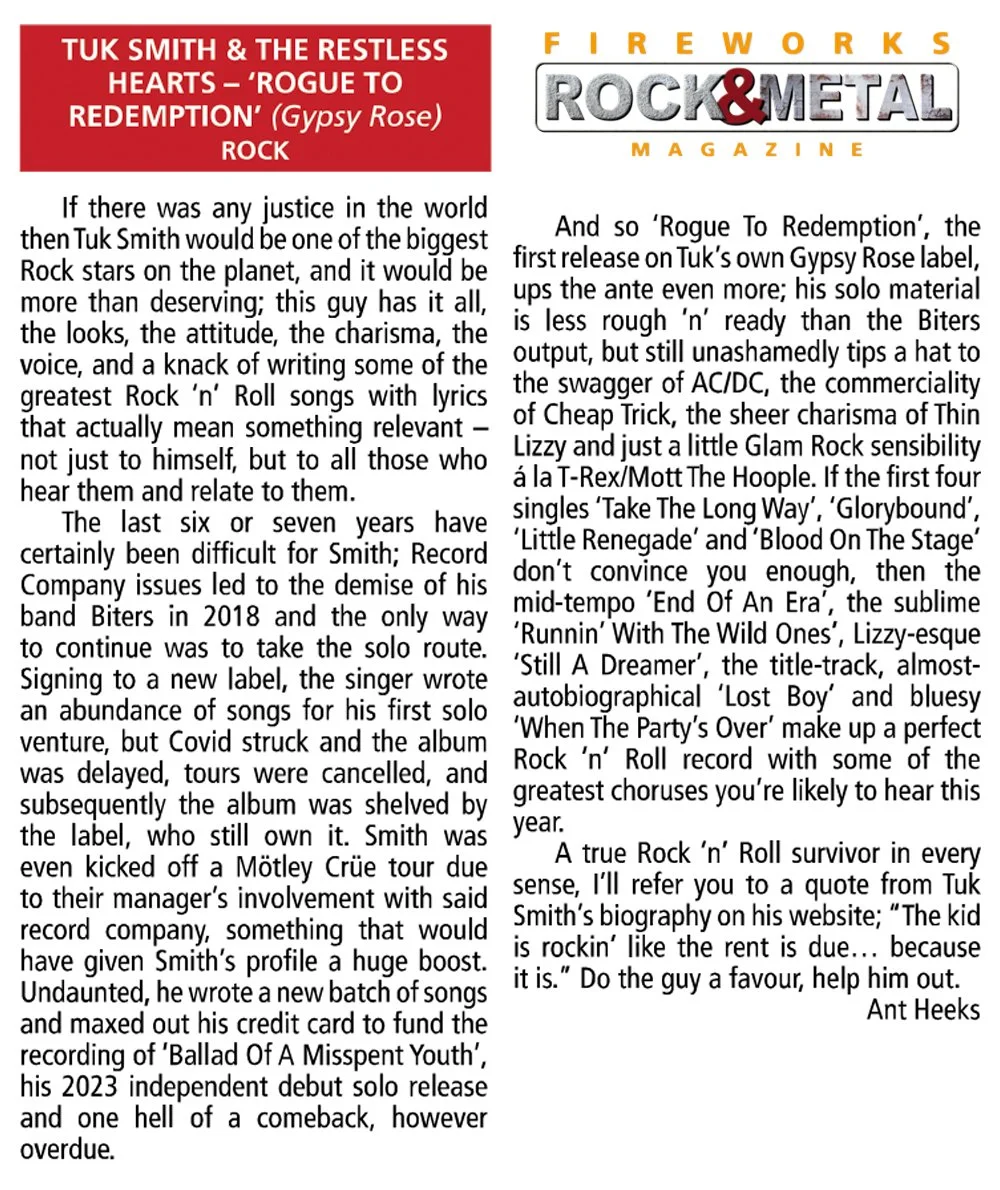 The result is Rogue To Redemption, Tuk’s second album with solo project The Restless Hearts. The sonic lovechild of Thin Lizzy, 90s power pop and melody- driven punk, it shows an artistic peak born from adversity. The sound of a man bottling a lifetime of experiences, stories and characters from working class America. A hero’s journey, picking up from 2022’s Ballad Of A Misspent Youth. And it’s all on him.